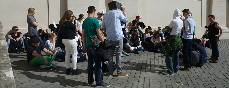 Szenario: Das Thermometer zeigt 26°C. Vor dem Petersdom hat sich in der prallen Sonne eine Gruppe von ca. 30 Personen versammelt. Eine Person spricht zu der Gruppe. Im Halbkreis stehend und sitzend verdecken sich die Personen gegenseitig. Manche hören zu, einzelne unterhalten sich. Einige halten Papiermaterial in den Händen. Weniger als ein Drittel setzt sich mit dem Material auseinander. Manchen erscheint es sinnvoller, dieses als Sonnenschutz zu nutzen. Die Situation erweckt den Eindruck von einer Exkursion bzw. Studienfahrt, die ebendiesen Standort auf dem Petersplatz für eine wohlfeile Ansprache im Gelände bzw. ein Referat ausgewählt hat. Insgesamt scheinen die Teilnehmenden jedoch wenig motiviert zu sein, der Ansprache zu folgen.