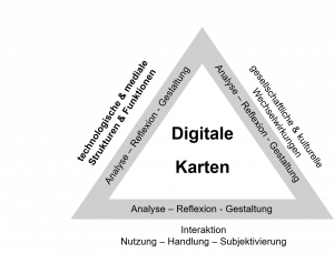Um an den fächerübergreifenden Lernbaustein anzuknüpfen, ist auch der geographische Lernbaustein inhaltlich auf den Nahostkonflikt ausgerichtet. Aus geographischer Perspektive fokussieren wir uns nun jedoch auf das Phänomen digitaler Karten, die ins Zentrum des Frankfurt-Dreiecks gestellt (siehe Abbildung 1) und aus technologisch-medialer Perspektive detaillierter beleuchtet werden. Die Wahl des Fachs und der Perspektive des Frankfurt-Dreiecks ist hierbei exemplarisch. Ebenso können andere geographische Aspekte ins Zentrum gestellt und aus den anderen Perspektiven beleuchtet werden.