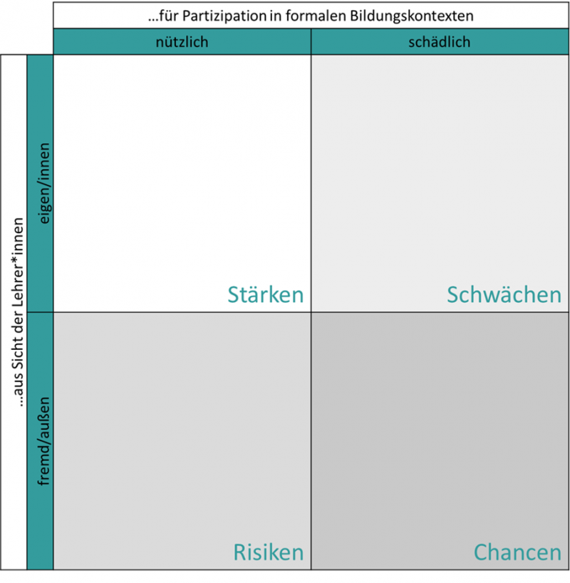 Die SWOT-Analyse wurde in den 1960er Jahren an der Harvard Business School als Instrument des strategischen Managements entwickelt. Die vierfeldrige Matrix dient der Ermittlung des Status Quo, der Standortbestimmung oder Untersuchung einer Organisation, einzelner Prozesse oder spezifischer Sachverhalte. Sie verfolgt das Ziel eigene bzw. interne Stärken und Schwächen zu ermitteln, die Stärken weiter aus- und Schwächen abzubauen. Der Blick auf Chancen und Risiken richtete sich nach außen, dient dabei aber auch zunächst einmal der Feststellung des Ist-Zustands. Ausgehend davon sollen Risiken minimiert und Chancen maximiert werden (Schawel & Billing, 2011). Im Kontext unseres Seminars eignet sich die SWOT-Analyse dazu, das partizipative Potenzial zu ermitteln und weiter auszubauen.