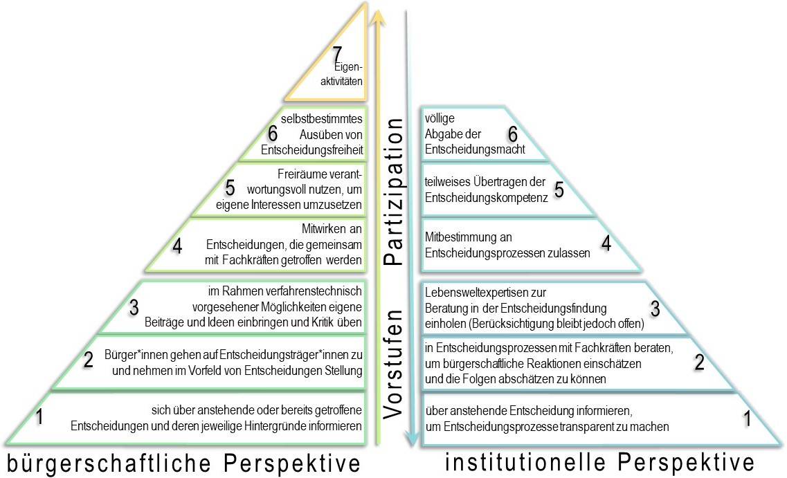 Neben gesellschaftlichen und politischen Formen unterscheiden sich partizipative Prozesse in ihrem Auslöser, der Vorgehensweise und der Tragweite der Einflussmöglichkeiten auf Entscheidungsprozesse. Straßburger & Rieger (2014) veranschaulichen den Grad der Einflussmöglichkeit auf Entscheidungsprozesse aus institutionell-professioneller Perspektive und aus Sicht der Bürger*innen im Modell der Partizipationspyramide. In drei Ebenen und sieben Stufen differenzieren sie zwischen: