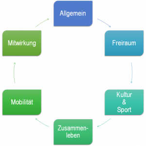 Im Rahmen des Projektes „Stadt-Checker: Indikatoren für eine kinder- und jugendgerechte Stadtentwicklung“ wurde ein Kriterienraster entwickelt, das eine Bewertung der Qualität von „Stadt“ und Stadtentwicklung aus der Perspektive von Kindern und Jugendlichen ermöglichen soll. Die Studie geht davon aus, dass Kinder und Jugendliche keine passiven, sondern aktive gesellschaftliche und politische Akteure und Gestalter*innen in der Stadtentwicklung sind, die sich mit ihren gruppenspezifischen Anliegen und Bedürfnissen, Ansprüchen, Werturteilen und Vorschlägen verstärkt in Fragen der Stadtentwicklung einbringen. „Der Stadt-Checker setzt an der Sichtweise und den Aktivitäten von Kindern und Jugendlichen im städtischen Raum an und erleichtert die niedrigschwellige Beteiligung an Stadtentwicklungsprozessen, deren Ergebnisse dann in formale Entscheidungen einbezogen werden können. Planungsprozesse und städtebauliche Maßnahmen werden auf diese Weise schon frühzeitig von Kindern und Jugendlichen selbst „gegengecheckt“ (BBSR 2018). Das entwickelte Kriterienraster umfasst hierfür insgesamt 42 Indikatoren einer kinder- und jugendgerechten Stadtentwicklung in sechs Kategorien: