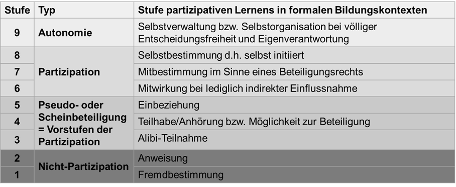 Auf Basis von Arnstein (1969), Schröder (1995) und Fletcher (2005) veranschaulicht Mayrberger das partizipative Lernen in formalen Bildungskontexten anhand des Einflusses der Lernenden in insgesamt 9 Stufen. Gegliedert in Nicht-Partizipation, Pseudo- oder Scheinbeteiligung, Partizipation und Autonomie gibt das Modell erste Hinweise darauf, wie Partizipation mit digitalen Geomedien in formalen Bildungskontexten (nicht) gelingen kann (Mayrberger, 2012).